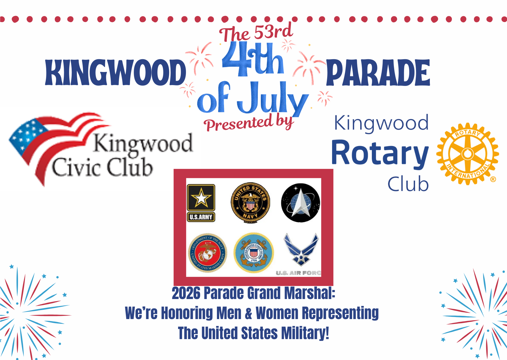 The Kingwood Civic Club is a 501(c)3 Charitable Organization and Kingwood Rotary Club is a 501(c)4 Community Service Organization. Together, we will once again be hosting the July 4th Parade this year.