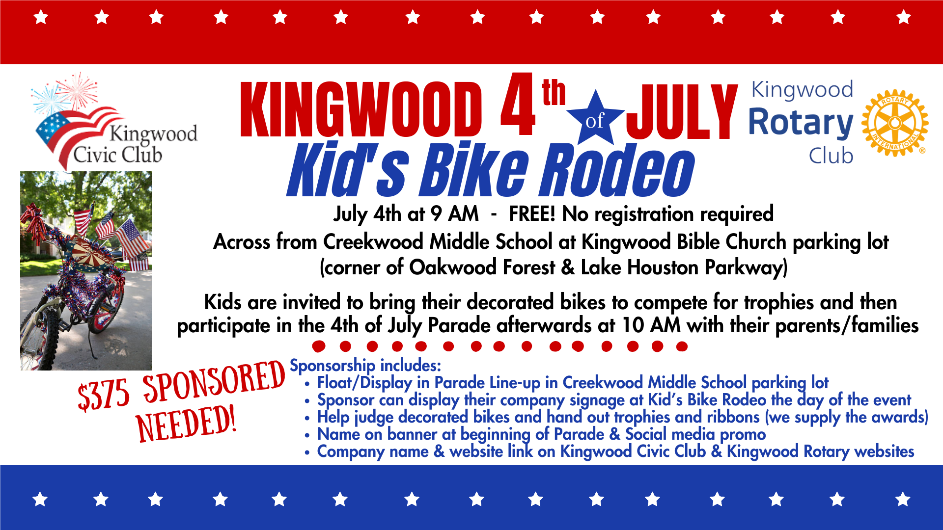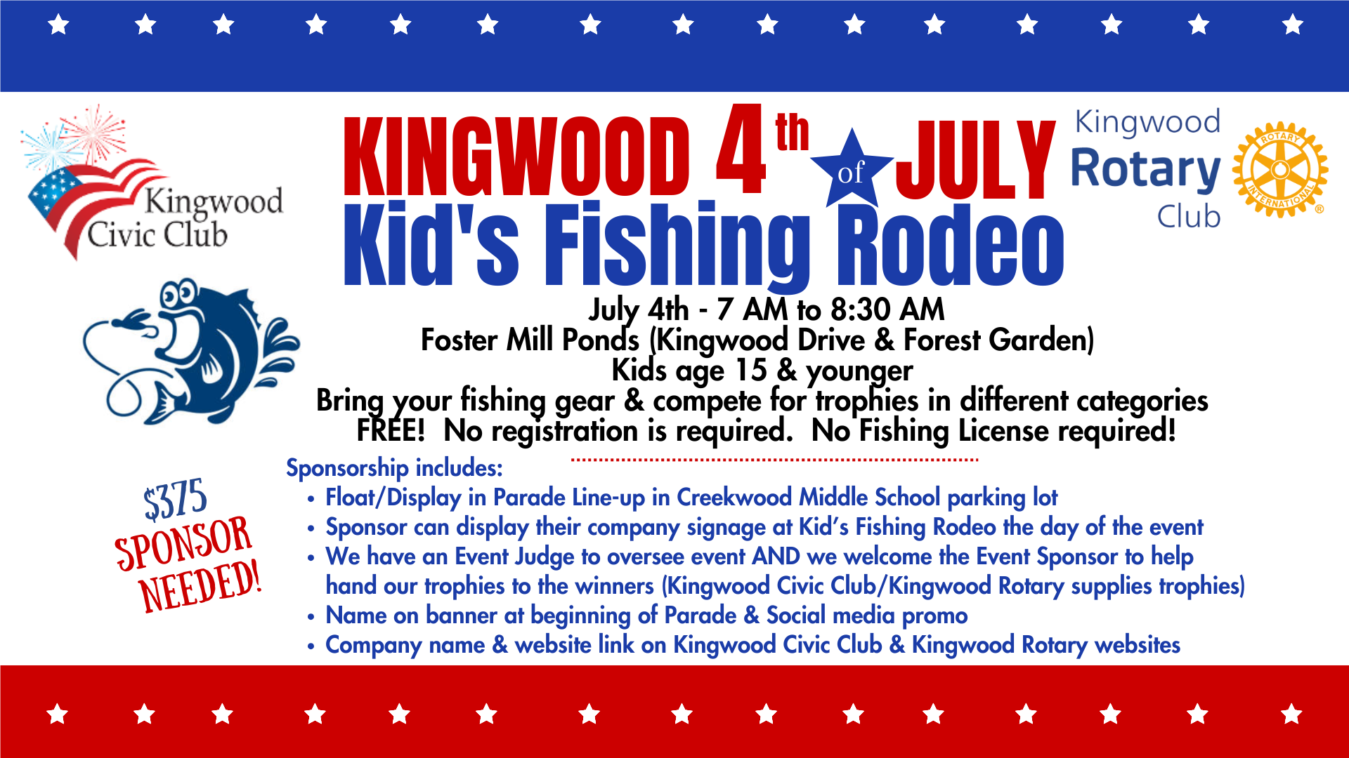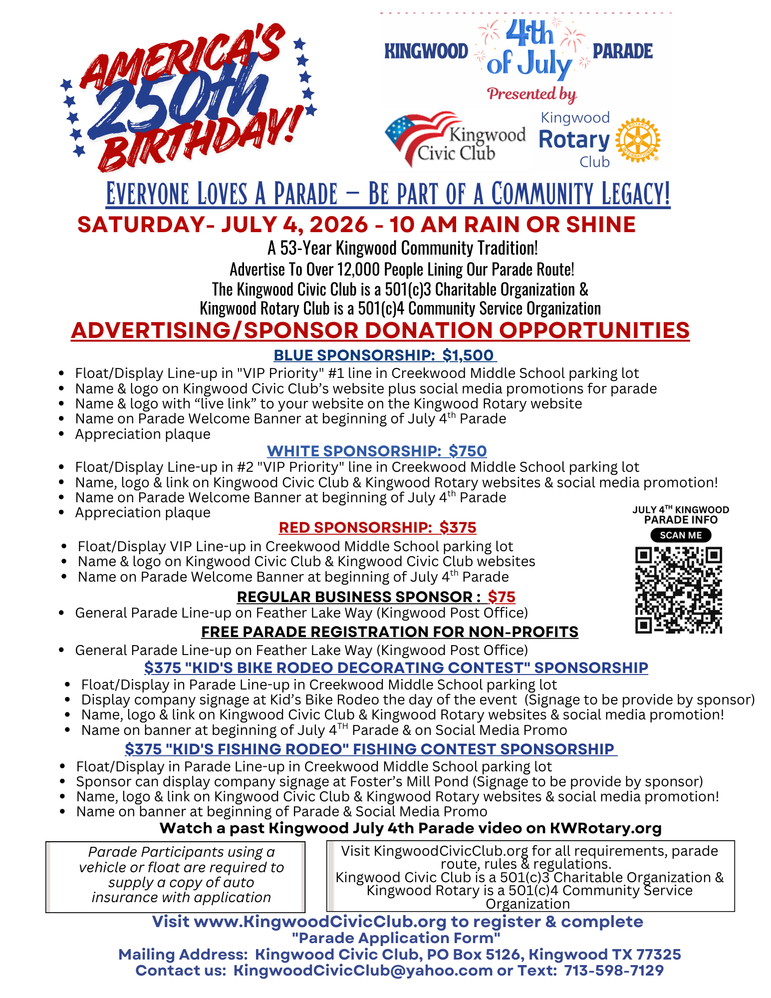 For questions about other sponsorship opportunities, please send an email to: kingwoodcivicclub@yahoo.com or send Text to Charlie at 713-598-7129.